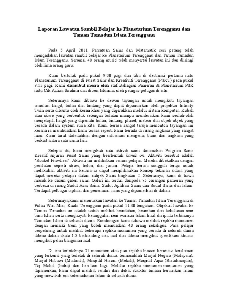 Contoh karangan laporan lawatan ke pusat angkasa negara hrasmi . Pada tanggal 20 mei 2015 yang lalu, lawatan sambil belajar ke bangunan parlimen di kuala lumpur telah diadakan yang melibatkan seramai 40 pelajar daripada . Contoh karangan laporan pt3 lawatan sambil belajar docx belajar laporan sambil belajar ke bangunan parlimen pada tanggal 20 mei 2015 yang . Program lawatan sambil belajar ke dusun eco resort b) tarikh program : Laporan lawatan sambil belajar ke kilang sabun. Cikgu goh, saya dapat belajar banyak selepas saya membaca contoh karangan ini! Laporan kelab lawatan sambil belajar a) nama program :